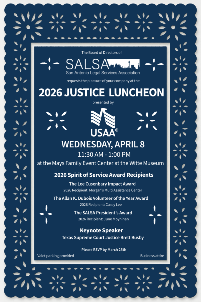 Ready to take an extended-representation case in your area of expertise? Pro bono cases are referred from SALSA’s Veterans Legal Advice Clinic and from our community partner organizations including Texas RioGrande Legal Aid.
